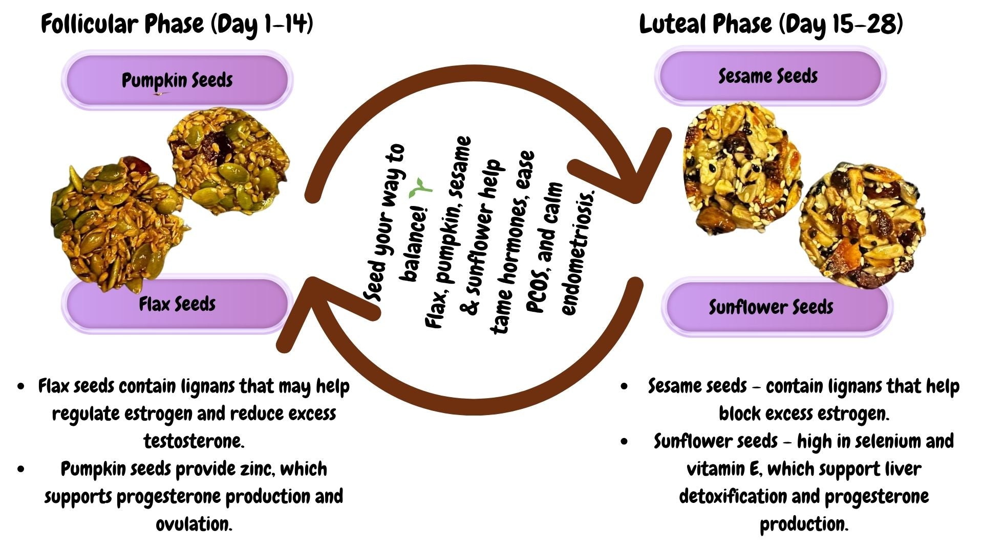 Nourish your cycle naturally with our Seed Cycling Clusters — four powerful seeds, two supportive phases, one healthier you.